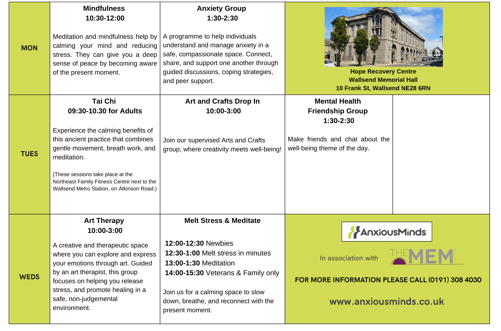 Hope Centre Activities Monday to Wednesday 10am – 3pm